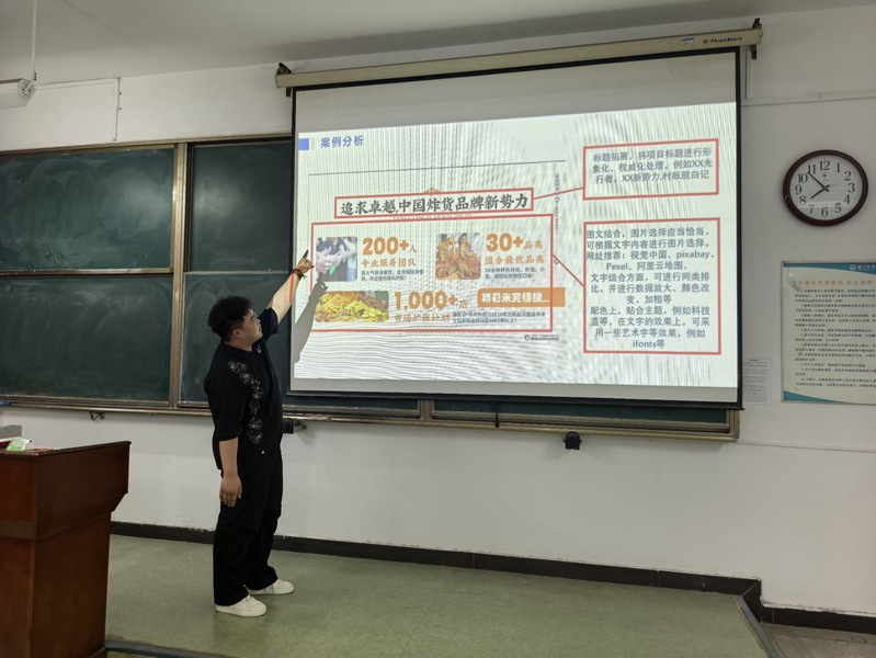 随后,2022级学生朱齐贤分享比赛实战经验。他聚焦“打造高质量科研汇报”,从内容逻辑、PPT设计(色彩搭配、信息可视化)到答辩技巧展开讲解,提醒学弟学妹科研需团队协作,耐心与沟通至关重要。