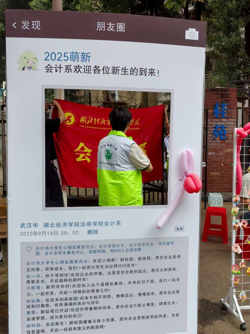 活动现场布置温馨,设置了“朋友圈打卡立牌”和糖果架,吸引新生与家长合影留念。彩色气球点缀其间,与系徽色彩呼应,营造出喜庆氛围。