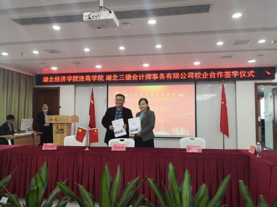 本网讯(通讯员 胡远景)11月5日下午,我院与湖北三德会计师事务有限公司校企合作签约仪式在湖北三德会计师事务所会议室隆重举行。院长王红教授与湖北三德会计师事务有限公司董事长董灏明先生作为校企双方代表进行签约,教务部、学生工作部、会计系负责同志,17名2022届毕业生代表及企业代表共同参加了签约仪式。