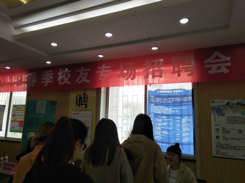本网讯(特约记者 胡远景)“学长学姐来招聘我们,我们没理由不积极去应聘啊”。4月15日上午9时30分,在会计系的2019年春季校友专场招聘会现场,该系应届毕业生孔琨同学激动地说。本次春季校友招聘会共吸引了来自万科财务共享中心和武汉三源特种建材有限责任公司在内的8家校友企业,提供50余岗位。