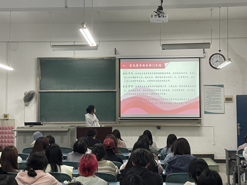 会议伊始,学风督导团指导老师童菲老师对新成员进行了意义重大的讲话,鼓励并希望新成员们在做好工作的同时,提高自身的修养和品性,在学风督导团这个平台上得到更好锻炼和提升。随后,学风督导团团长王真仪向全体成员讲解了团内规章制度,宣读督导团的宗旨和理念,并对新学期学风督导团的新成员进行宣传动员。为了让全体团员更快融入学风督导团、更加明确各部门职责,各部门部长分别上台进行自我介绍,讲解主要工作内容,并表达了对新学期工作的期许。