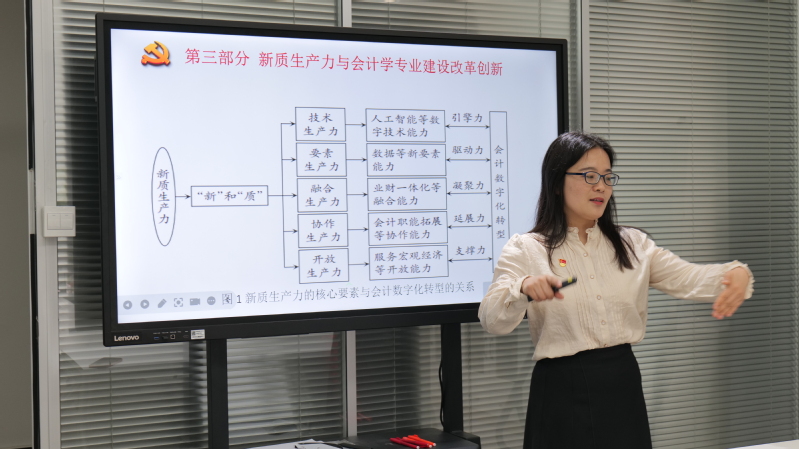 “新质生产力是对‘传统生产力’的继承和创新,适应新技术、新要素、新模式、新产业,以科技创新引领的高质量发展为目标。展望未来,新质生产力视域下的当代中国会计,将以马克思主义生产力理论为指导,以科技创新为引领,以推动我国经济社会高质量发展为目标,通过持续深化改革,将呈现出一种全新的面貌。”会计系教工第一支部党员龚振中教授听完党课后,发出了如此感慨。