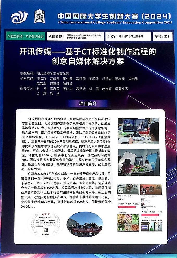 本次大赛我院共计708支学生团队报名参赛,参赛项目质量和数量均取得新突破。我院工商管理系校友陈陆辉创业项目在中国国际大学生创新大赛(2024)湖北省116202项作品中脱颖而出,与全省高教主赛道70266项作品同台竞技,突出重围,获得高教主赛道现场赛决赛全省第32名、本科生创业组全省第6名的好名次,成功斩获1项省级金奖。实现我院在该项赛事的新突破,充分展示万搏买球联赛官网(中国)官网创新创业教育成果。