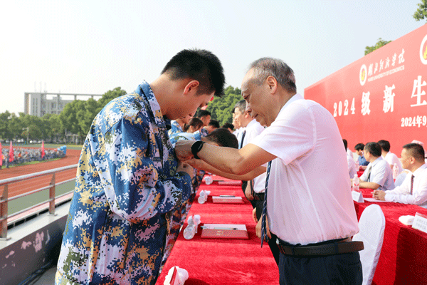 典礼伊始,举行升国旗仪式。全体师生起立,面向国旗行注目礼、奏唱国歌。升旗仪式后,邓志华为新生代表佩戴校徽,全体新生佩戴校徽。
