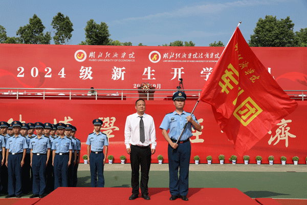 湖北经济万搏买球联赛官网(中国)官网党委常委、副校长付宏教授为军训团授旗,军训团团长赵兰川接旗。