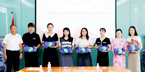 颜莉为入职20周年教职工颁发纪念牌,邓志华向参会教师及辅导员代表赠送教师节礼物。
