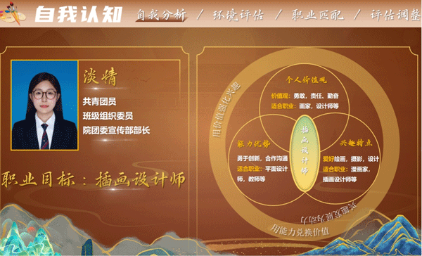 该赛道一等奖获得者,视设23402班淡婧以《笔锋所至,皆为人生》为主题从自我分析、环境评估、职业匹配、评估调整四个方面进行了展示。该生在校期间荣获国家励志奖学金、校级一等奖学金,积极参加各类校级创新创业和专业技能竞赛,参加志愿服务累计时长达228小时,能熟练运用Photoshop、Procreate、AI等各类绘画软件和工具,独立创作设计多幅作品,目前职业目标是做一名插画设计师。