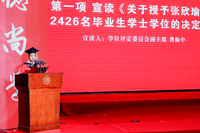 副院长、学位评定委员会副主席龚振中教授宣读《关于授予张欣瑜等2426名毕业生学士学位的决定》。