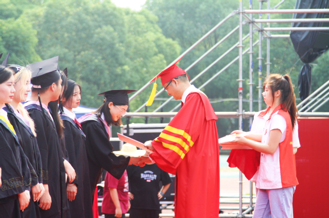 典礼现场,优秀毕业生代表、考取研究生毕业生代表接受颁奖。毕业生们依次上台接受老师拨穗正冠、颁发毕业证书、送毕业祝福及合影留念,现场洋溢着浓浓的温情和青春的气息。