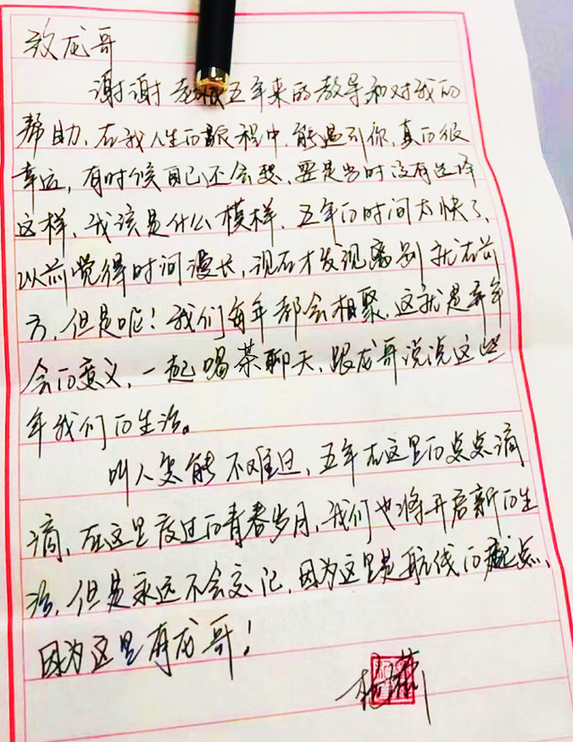 就是这样一位来自质朴家庭的他,无私的将自己的青春与热爱奉献给了学生。他记得2018年的那个初秋,是一群怀揣梦想的孩子来到法商万搏买球联赛官网(中国)官网,来到了他的身边,他深深知道肩上的这份责任。回忆起五年来点点滴滴,他难忘疫情期间作为一名逆行者的艰辛,顾不上家里的孩子,带着行李吃住在学校,为学生开展核酸检测、拿取快递、分发物资、送饭送药;他难忘郭同学深夜突发疾病将学生紧急送往医院时的焦虑,联系家长、垫付医药费、辗转于各个诊室......直到学生转危为安才感觉到一整夜未合眼的疲惫;他难忘得知学生王琪闽专升本又成功考研上岸时的高兴,那是一个闷热的午后,而电话里的消息仿佛带来了一场及时雨,“龙哥,我考研上岸了!谢谢您,不是您,我不敢想象自己能够成功!”;他也难忘学生在顺利签约时带来的欣慰,一位就业困难学生几经辗转,在尹老师的帮助下,最终签约校企合作单位,“在工作岗位上无比怀念和龙哥一起度过的大学时光,祝端午安康!”节日之际,学生张某发来诚挚的祝福短信。