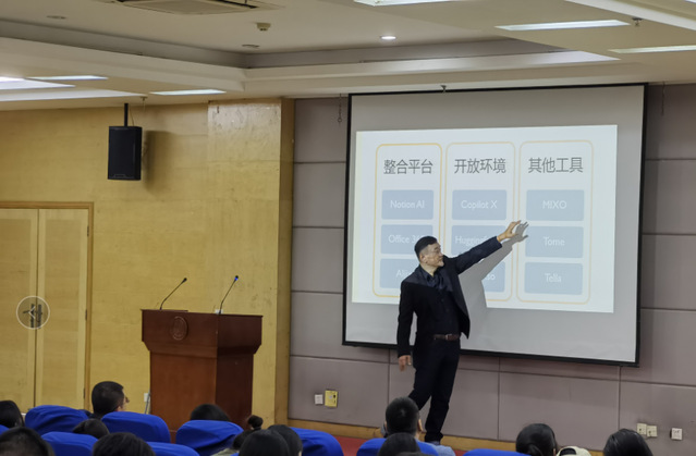 最后院长陈昀教授对白培铭总裁的到来表示感谢,并提出三个关键词“变化”、“差距”、“思考”引发同学们的思考。希望同学们能够了解AI,认识AI,掌握AI百宝工具。