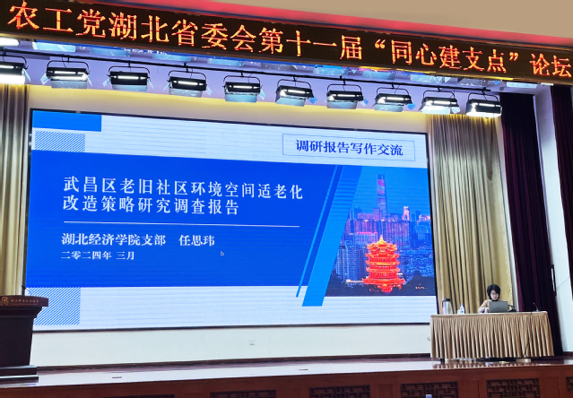 本网讯(通讯员 谭艳)3月26日,中国农工民主党湖北省委会在武汉召开“凝心铸魂强根基,团结奋进新征程”主题教育总结大会,并表彰2023年度参政议政工作先进集体、个人与优秀成果奖获得者。我院农工民主党党员、传媒与艺术设计系青年教师任思玮获农工党湖北省委会年度参政议政优秀调研报告一等奖,并在总结大会上做题为《武昌区老旧社区环境空间适老化改造策略研究》的学术报告。