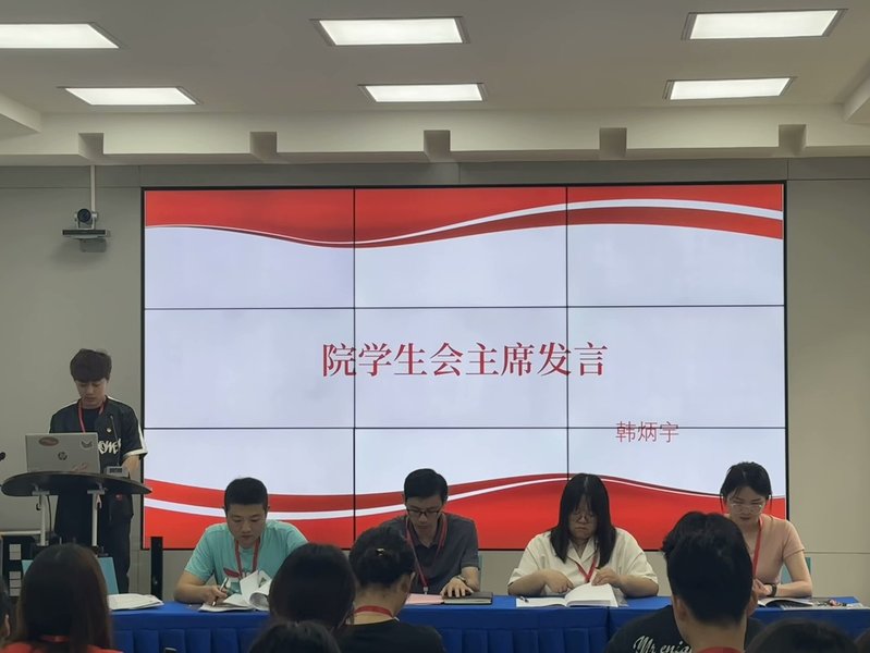 大会伊始,全场肃立,伴随着庄严的国歌声,学生代表们满怀激动与期待,共同见证了这一重要时刻。院学生会主席韩炳宇首先上台致辞,他对过去一年学生会在各项工作中取得的优异成绩给予了高度评价,并对新一届学生会表达了殷切期望,希望其能够继往开来,再创佳绩。