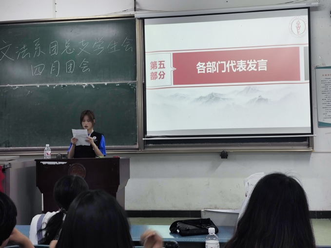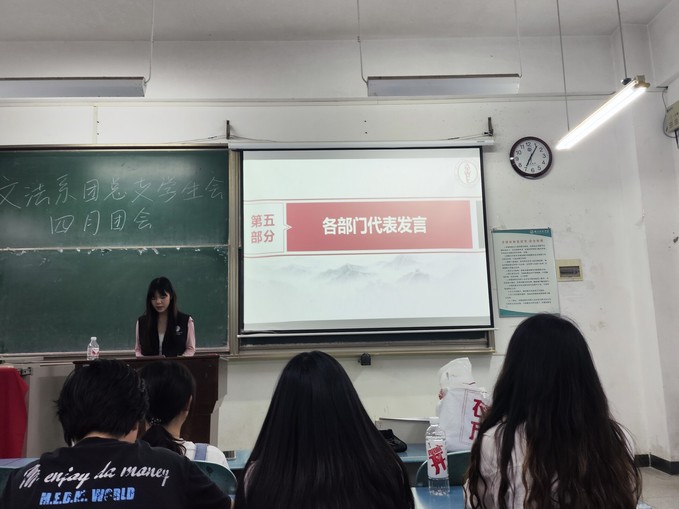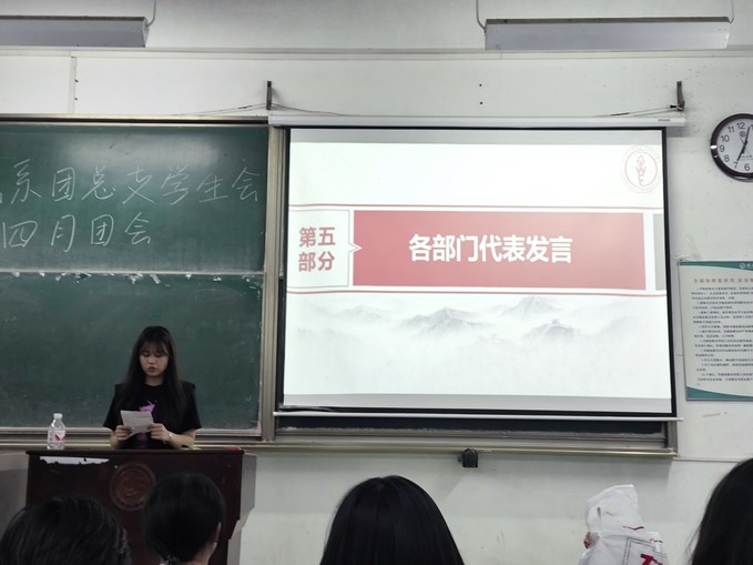 会议中,七位部门干事代表依次上台发言,分享自己的心得体会,不仅深化了同学们对两个学习专题的理解,更激发了大家为祖国的繁荣发展贡献力量的热情。