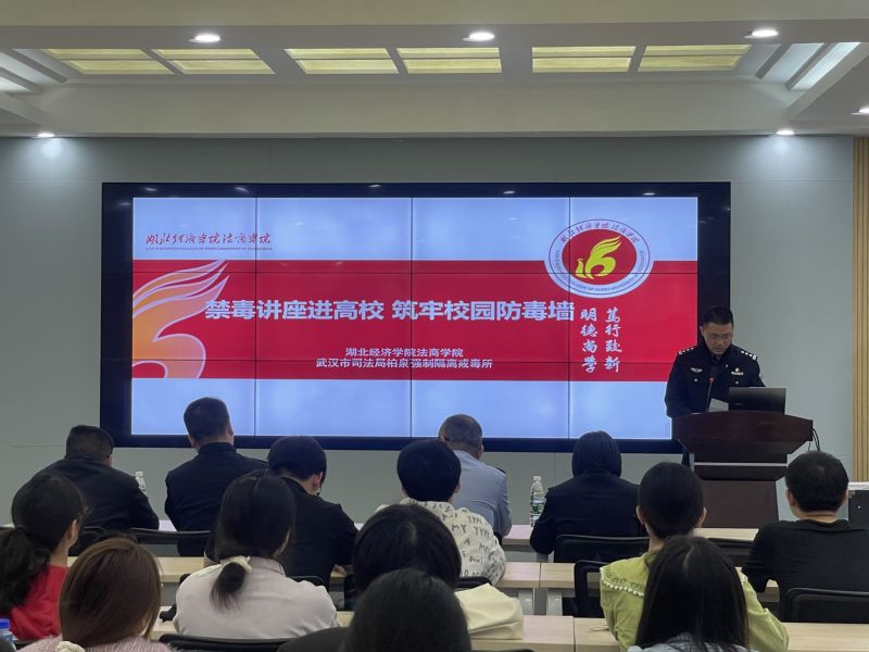 在法商楼111宣讲大厅,我院与柏泉强制隔离戒毒所联合举行了“禁毒讲座进高校·筑牢校园防毒墙”专题讲座,主讲人李守钊警官通过典型案例和宣传视频来讲解禁毒知识。参会学生踊跃参与禁毒知识问答互动。