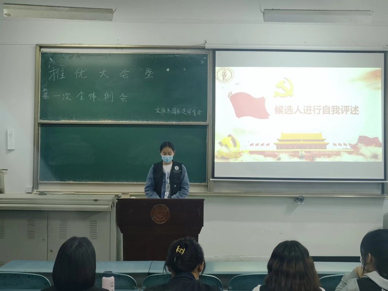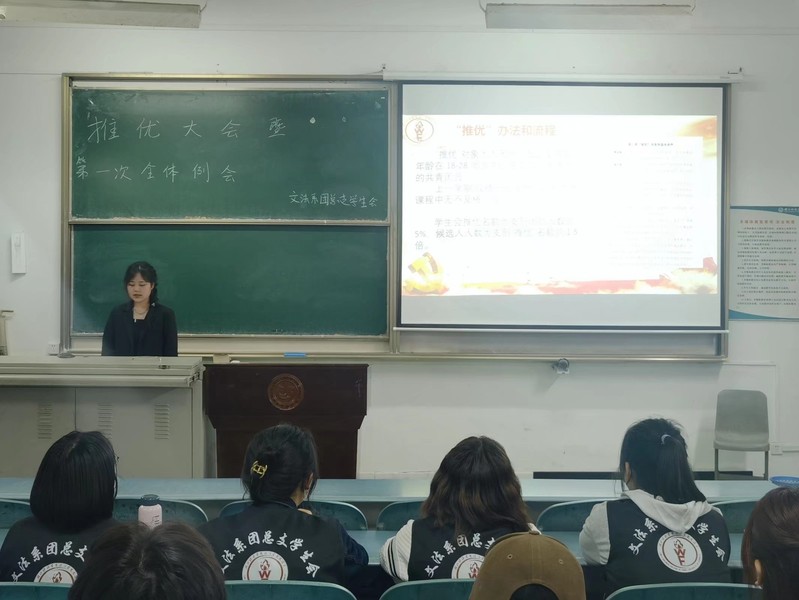 会前对学生会全体成员点名。“推优”大会旨在对本次“推优”对象进行审议。首先,组织部部长田思琪公示本次“推优”候选人名单并对与会成员介绍“推优”办法和流程,接下来由推优候选人进行自我评述,学习部干事柳叶同学上台发言。经投票表决,柳叶同学全票通过,推荐为本学期文法系团总支学生会入党积极分子候选人。