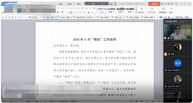 会议伊始,邢老师向各班团支书详细讲解了“2020年5月推优工作指导”,并表示受新冠疫情影响,原定于本学期2-5周开展的“推优”工作,推迟到5月-6月线上举行。他指出,要按照要求认真开展“推优”候选人酝酿会议、“推优”支部大会,各班团支书做好会议记录,按时上交推优材料,并将推优大会开展后的材料上传智慧团建。培训期间,邢老师就推优工作培训内容向团支书进行随机点名提问,进一步加深了团支书对推优工作的熟悉度。