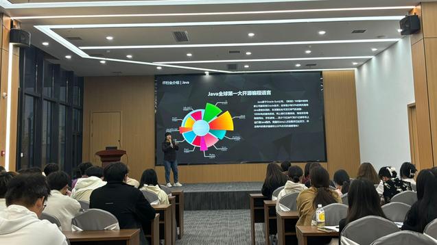 随后的交谈会上,中软国际黄晶晶老师为同学们介绍了现阶段本专业的就业形势、就业岗位、政策风标及薪资待遇,为同学们介绍了什么是Java,什么是前端技术,介绍了开发语言、开发项目以及开发环境,同时也为同学们展示了丰富的职业发展赛道,让同学们对未来的方向有更清晰的认知。根据大家所学专业,她建议大家未来选择web前端工程师、Java工程师、数据分析师等就业岗位。本场座谈会在为大家答疑解惑的同时,也为大家未来的发展规划提供了有益的指导。