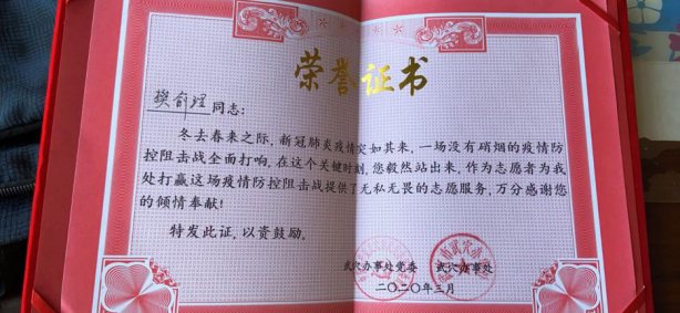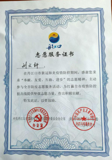 自疫情发生以来,电商19301班刘文轩同学,主动报名参加十堰市丹江口市大坝二路办事处社区防疫志愿者。刘文轩同学负责对社区卡点出入的上班工作人员进行登记,临时外出人员检查出入通行证、登记人员及核查往返情况。在疫情严峻时期,他同社区其他志愿工作者一起,每天认真开展卡点值守、巡逻、上门登记居民信息、为居民采购药品以及解答社区工作相关疑问等工作。“疫情保卫战”虽然已经接近尾声,但社区的防控工作还在紧张进行中,疫情当前,容不得半点疏忽。刘文轩同学表示仍然会切实落实好防疫工作,为社会,为广大居民做出实质性的贡献。中共丹江口市精神文明建设指导委员会办公室、共青团丹江口市委授予刘文轩同学抗击疫情志愿者纪念证书就是最有力的肯定。