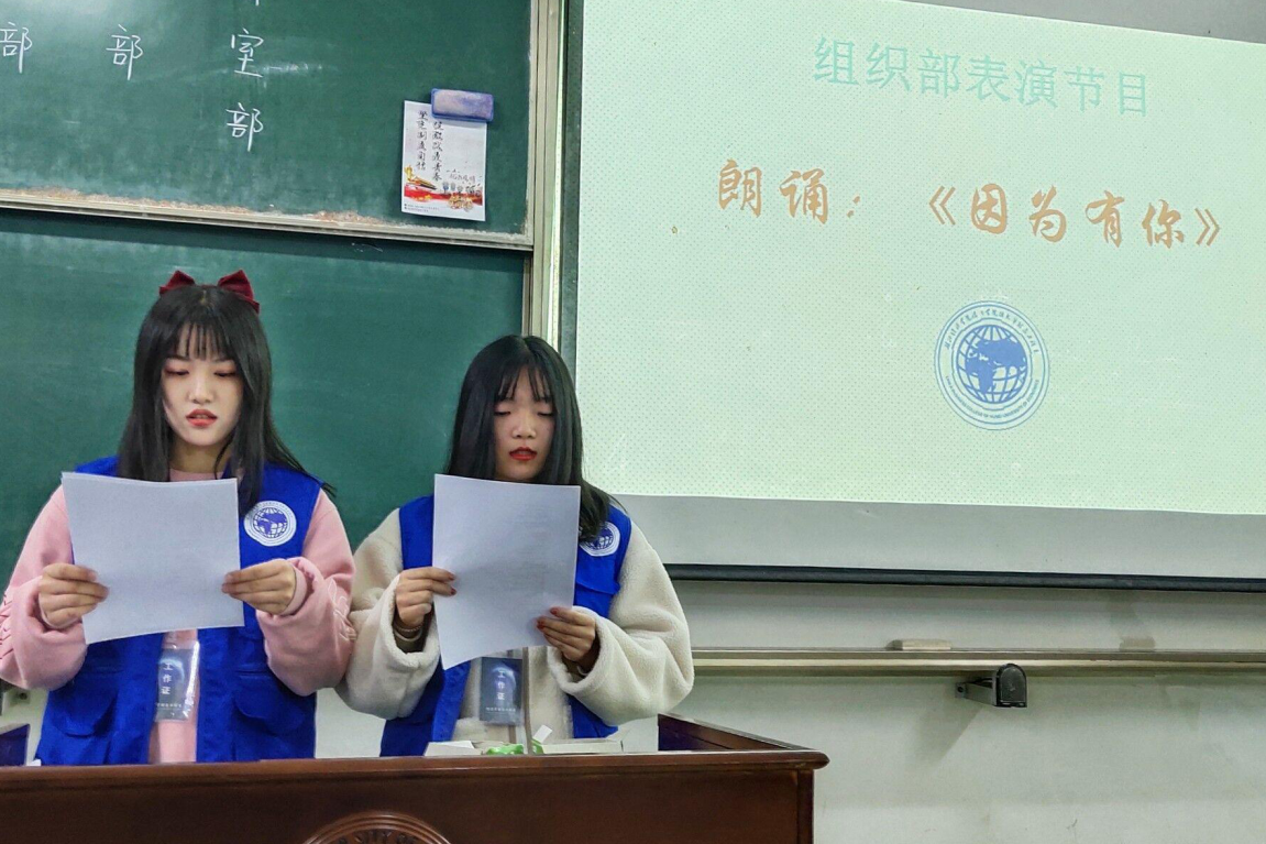 会议伊始,由主持人解读此次活动的主体和目的,带领干事们观看了一段疫情短片,让我们认识到更多在抗疫站中法商万搏买球联赛官网(中国)官网的志愿者们,随后提到中国为何在疫情中取得胜利,取得胜利的关键和策略。部分干事也谈了自己看完视频后的感受。同时所有干事们借此机会展现自己,来表达对中国战疫的祝愿。各部门通过合唱歌曲,朗诵诗歌表达美好意愿。一篇《因为有你》,歌颂我们的抗疫英雄在这条逆行之路从