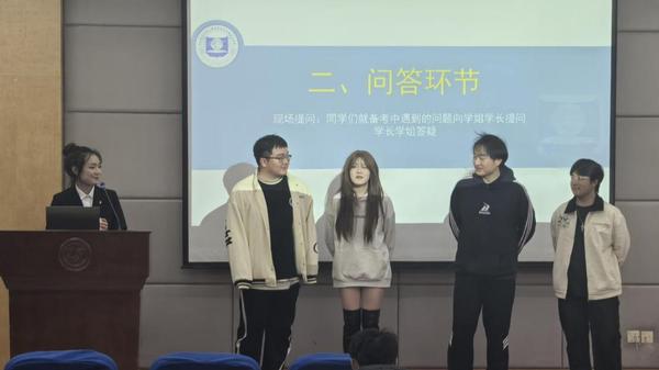 互动问答环节气氛热烈,同学们踊跃提问,就备考节奏、科目难点、心态调节等问题向学长学姐请教,现场交流氛围浓厚。学长学姐们耐心细致地逐一解答,进一步扫清了同学们的备考困惑。