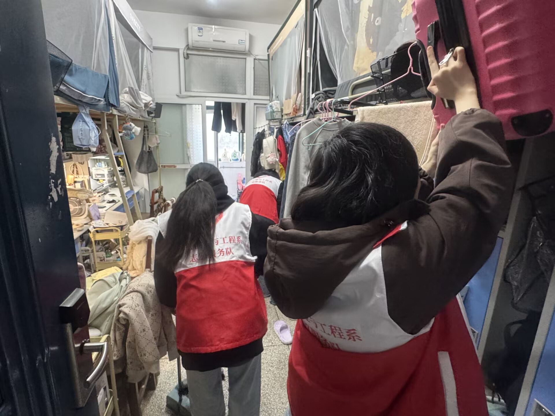 在校园清理的同时,老师带领志愿者深入各学生宿舍,向同学们宣讲爱国卫生运动的精神内核与时代意义,倡导文明健康、绿色环保的生活方式。志愿者们结合寝室实际,讲解宿舍卫生整理、通风消杀、个人防护等实用知识,引导大家树立“讲卫生、爱环境、护健康”的良好意识。在老师与志愿者的号召下,同学们积极响应,主动整理内务、规整物品,共同打造干净整洁、温馨舒适的住宿环境,让爱国卫生理念真正融入日常学习生活。