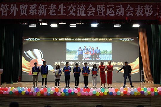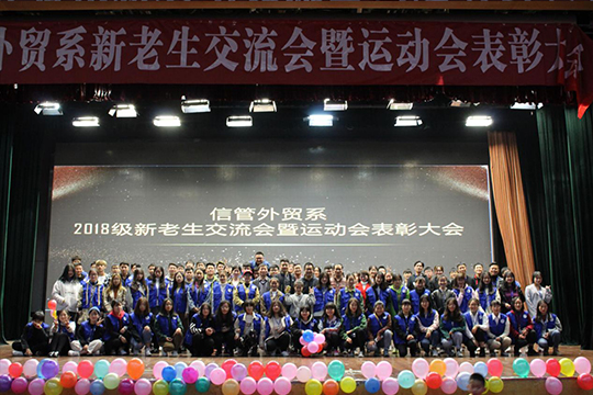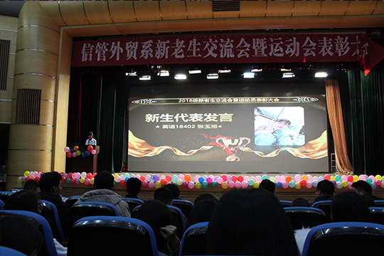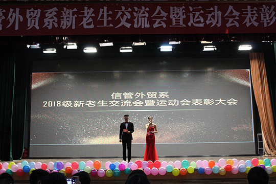 本网讯(记者 陈天唯)11月11日下午6:00,信息管理系、信息工程系、外语系、国际经济与贸易系在一号报告厅成功召开2018年新老生交流会暨运动会表彰大会。系党支部书记兼系主任张耀东、系团总支书记兼副主任吕蒙、新生班辅导员以及全体18级新生参会。主持人为李雪曼同学、陈希泽同学。