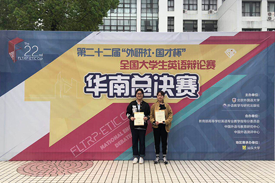 本网讯(特约记者 陶念 罗奥)4月14日,第22届“外研社·国才杯”全国大学生英语辩论赛华南地区总决赛(The 22th‘FLTRP Cup’National English Debating Competition)在汕头大学落下帷幕。由我院外语系陶念老师指导,经贸英语18401罗奥、经贸英语18402金雨萱同学组成的万搏买球联赛官网(中国)官网英文辩论队荣获华南区总决赛三等奖。