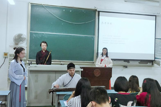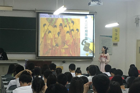 以《汉武大帝》、《贞观之治》影视赏析为引,展示传统服饰魅力,演奏传统乐器古琴。宣讲团服饰组成员以各式各样的传统服饰入场,瞬间引起了现场热烈的掌声。技艺组成员以《凤求凰》故事为引,介绍传统器乐古琴,李逸雄同学现场弹奏古琴名曲《凤求凰》片段,琴声悦耳动听,激发了学生们对传统乐器的喜爱。