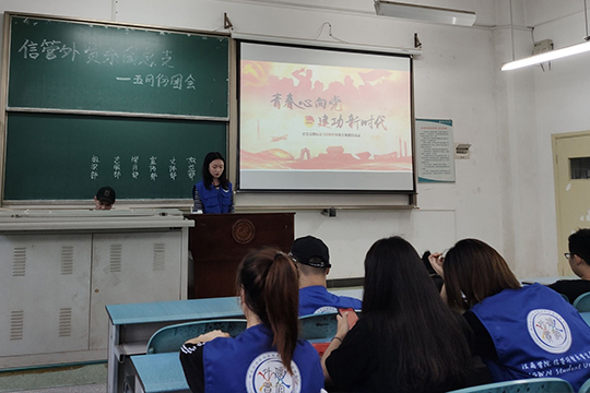 本网讯(特约记者 王洁)5月30号下午6:30,信息管理系、信息工程系、外语系、国际经济与贸易系学生会在教四102教室召开本学期第四次团会。本次团会主题为青春心向党,建功新时代“”。参会成员有主席团全体成员,各部门部长,以及学生会全体学生干事参加本次活动。刘静同学担任本次会议主持人。