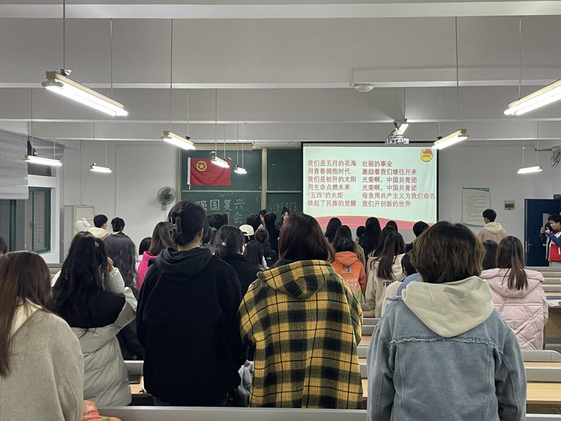 会议开始,两位主持人为大家介绍了本次会议主题及开展的意义。随后,带领大家重温入团誓词及合唱团歌,紧接着,观看了本次团会主题相关学习视频,同时,邀请许悠、汤润霏两位学生代表上台分享自己的学习心得体会。