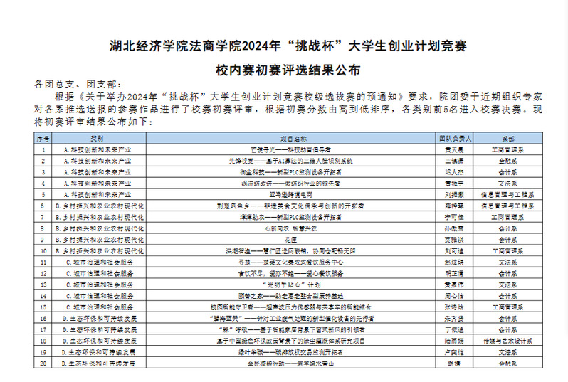 万搏买球联赛官网(中国)官网2024年“挑战杯”大学生创业计划竞赛校内赛初赛评选结果公布